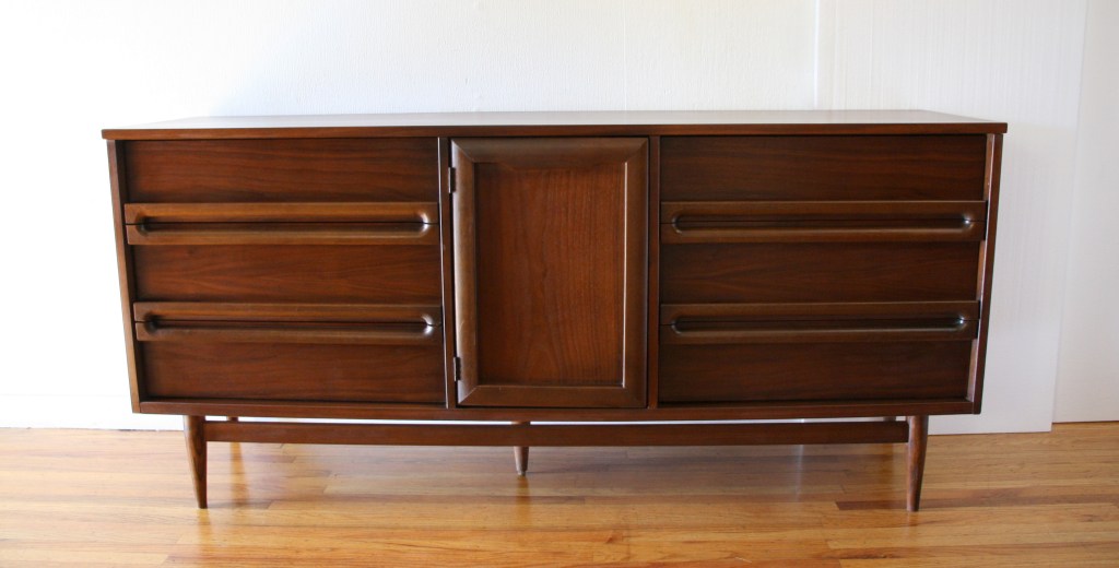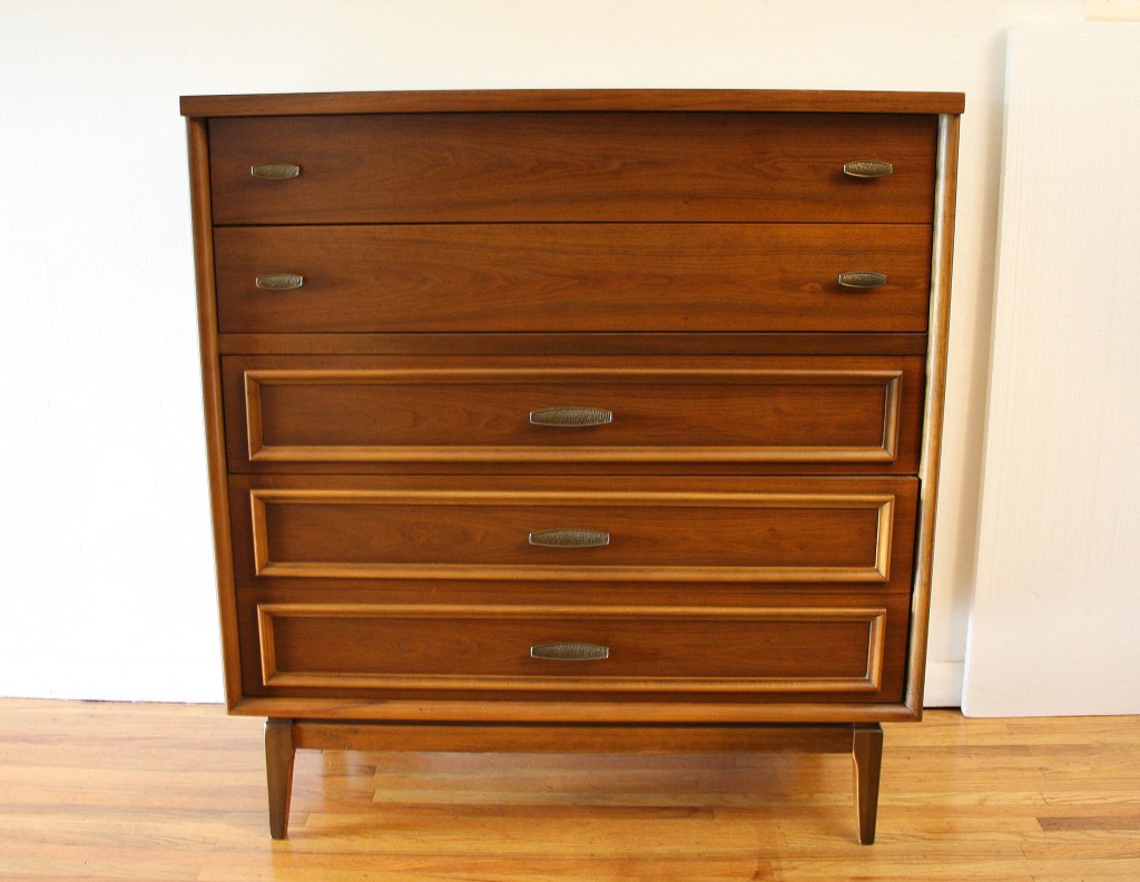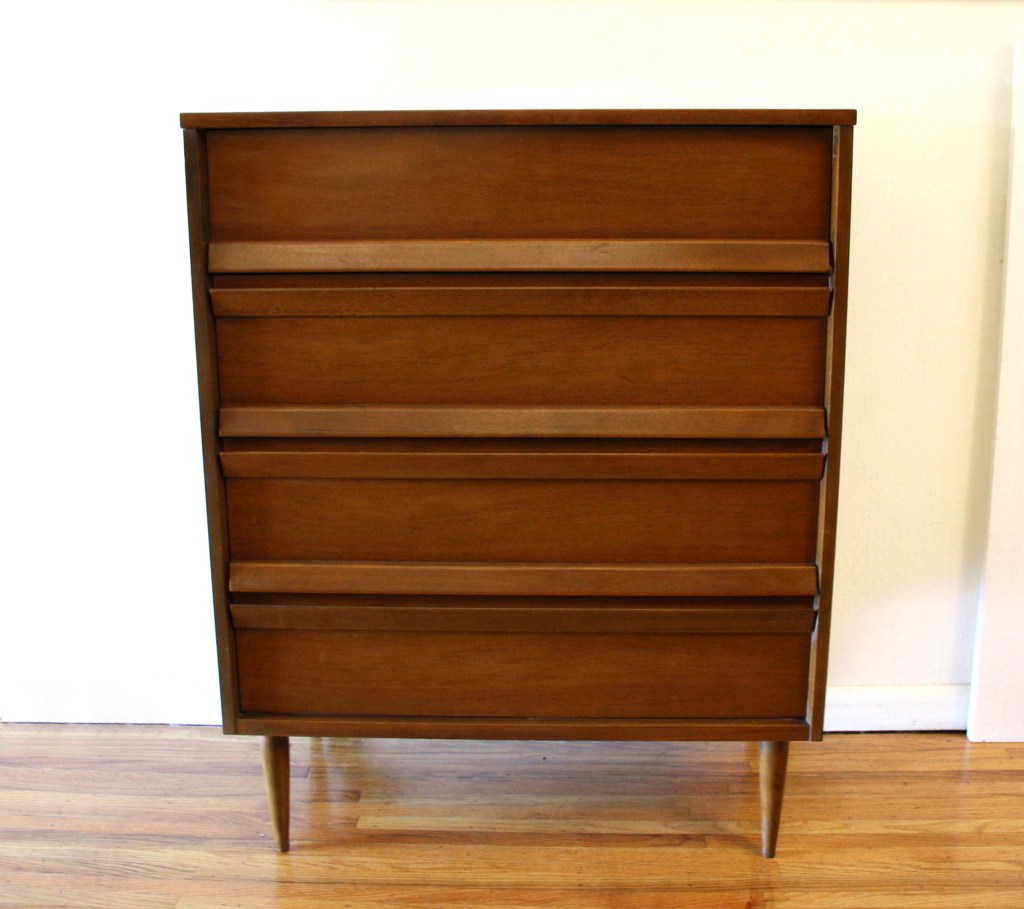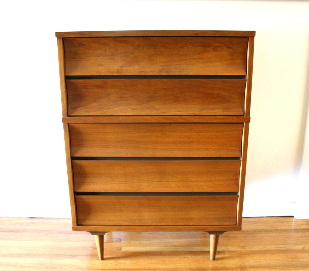 This is a mid century modern tall dresser armoire from Kent Coffey’s Tableau series. It has 5 dovetailed drawers with streamlined brass pulls, and a sculpted base with tapered legs. Dimensions: 40″W x 19″D x 46.5″H.