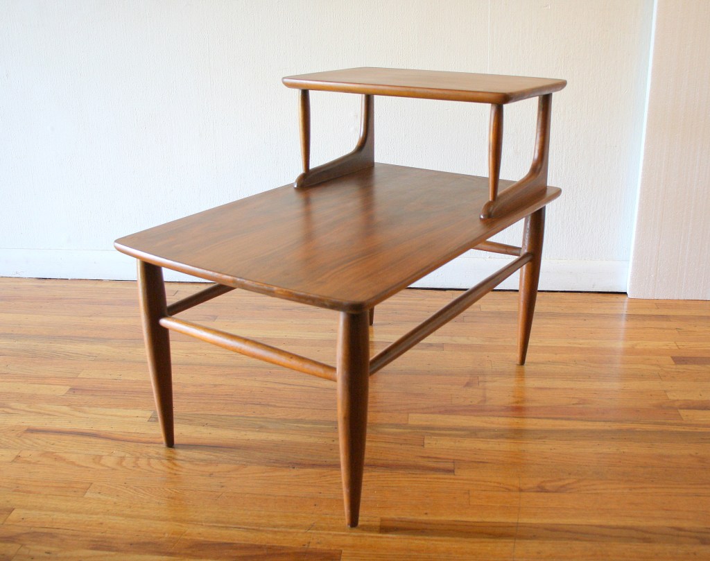 This is a mid century modern side end table with a 2 tiered design and slender tapered legs. Dimensions: 18″W x 29.5″D x 23.5″H.