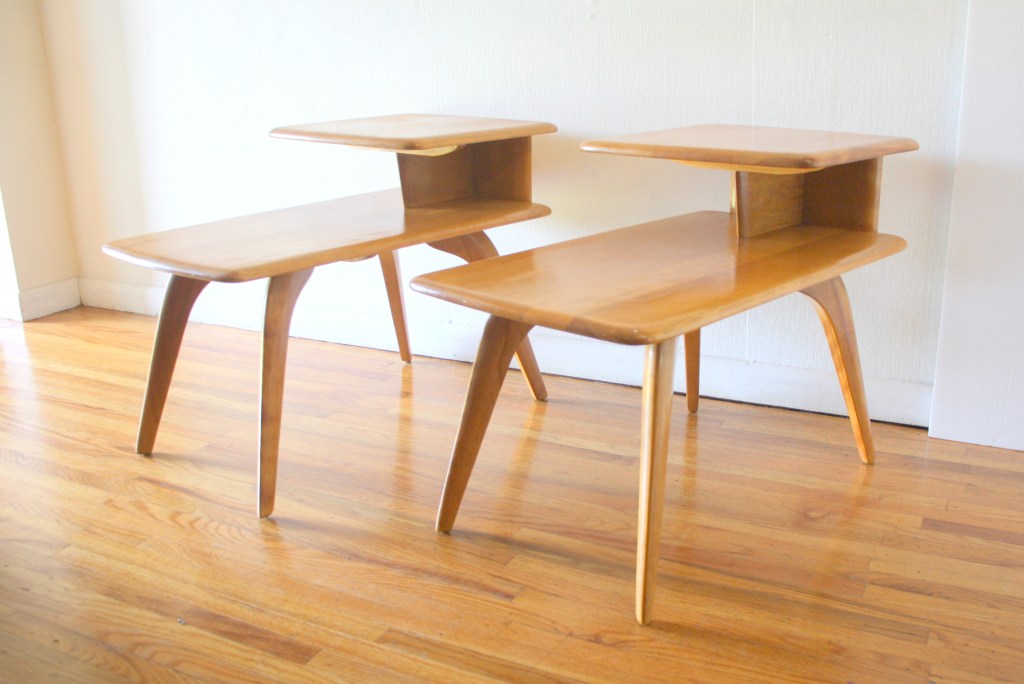 This is a pair of mid century modern 2 tiered side end tables by Heywood Wakefield. They have a top and bottom tier, and their signature curves and arched leg design. Dimensions: 17″W x 29″D x 22″H.