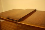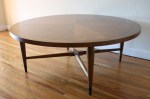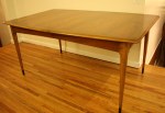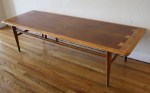 These are 3 mid century modern side end tables from the Lane Acclaim collection designed by Andre Bus. The tables have the signature dovetail design and tapered legs. The matching pair of side tables have a bottom shelf. Dimensions of the larger side tables: 21″W x 28″D x 20″H.