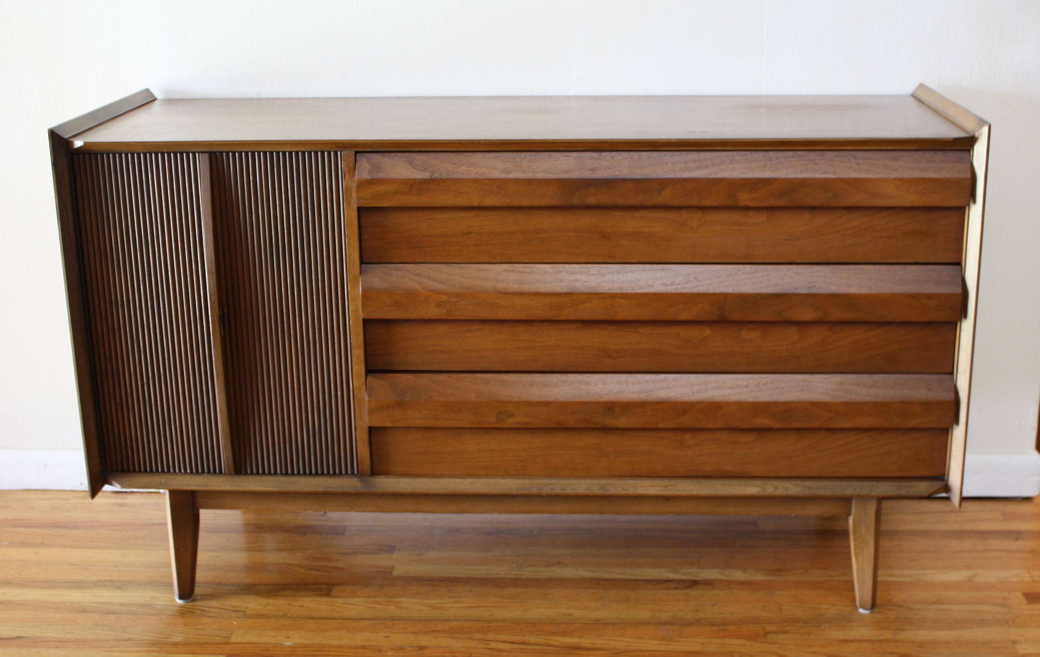 This is a mid century modern credenza by Lane. It has gorgeous angles and lines, a side cabinet, 3 dovetailed drawers, and tapered legs.