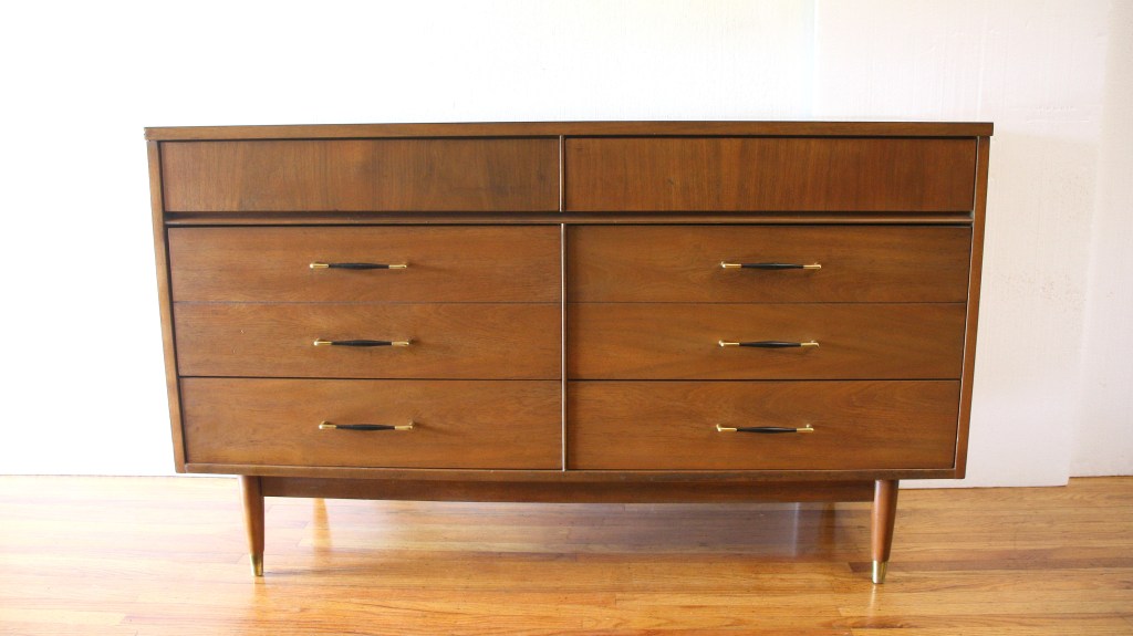 This is a mid century modern low dresser credenza by Bassett. It has six dovetailed drawers with a streamlined design and brass accented pulls, and brass tipped tapered legs. Dimensions: 54″W x 18″D x 32″H.