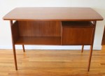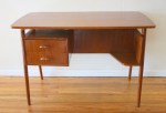 This is a mid century modern desk with a floating shelf design, 2 dovetailed drawers, and a front facing bookshelf. It has beautiful splayed legs and carved wood handles. Dimensions: 43.5″W x 24″D x 29″H.