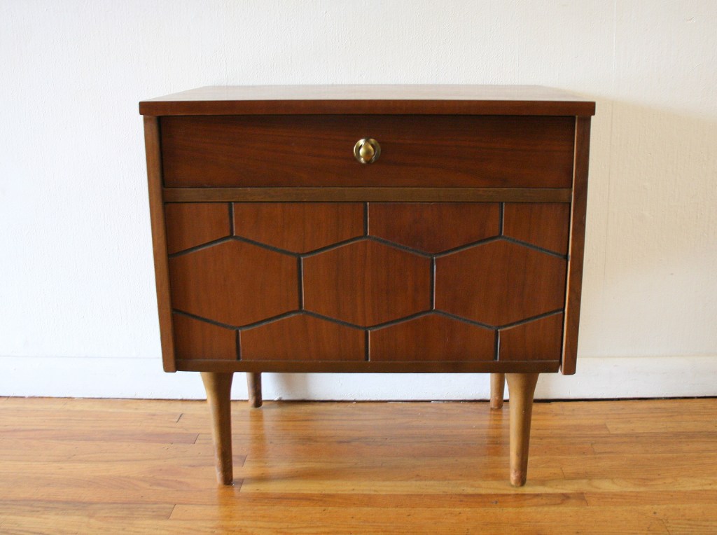 This is a mid century modern “Tuxedo” coffee table by Lane. It has their signature bowtie dovetailed design on top, and tapered legs. Dimensions: 70″W x 18″D x 13″H.