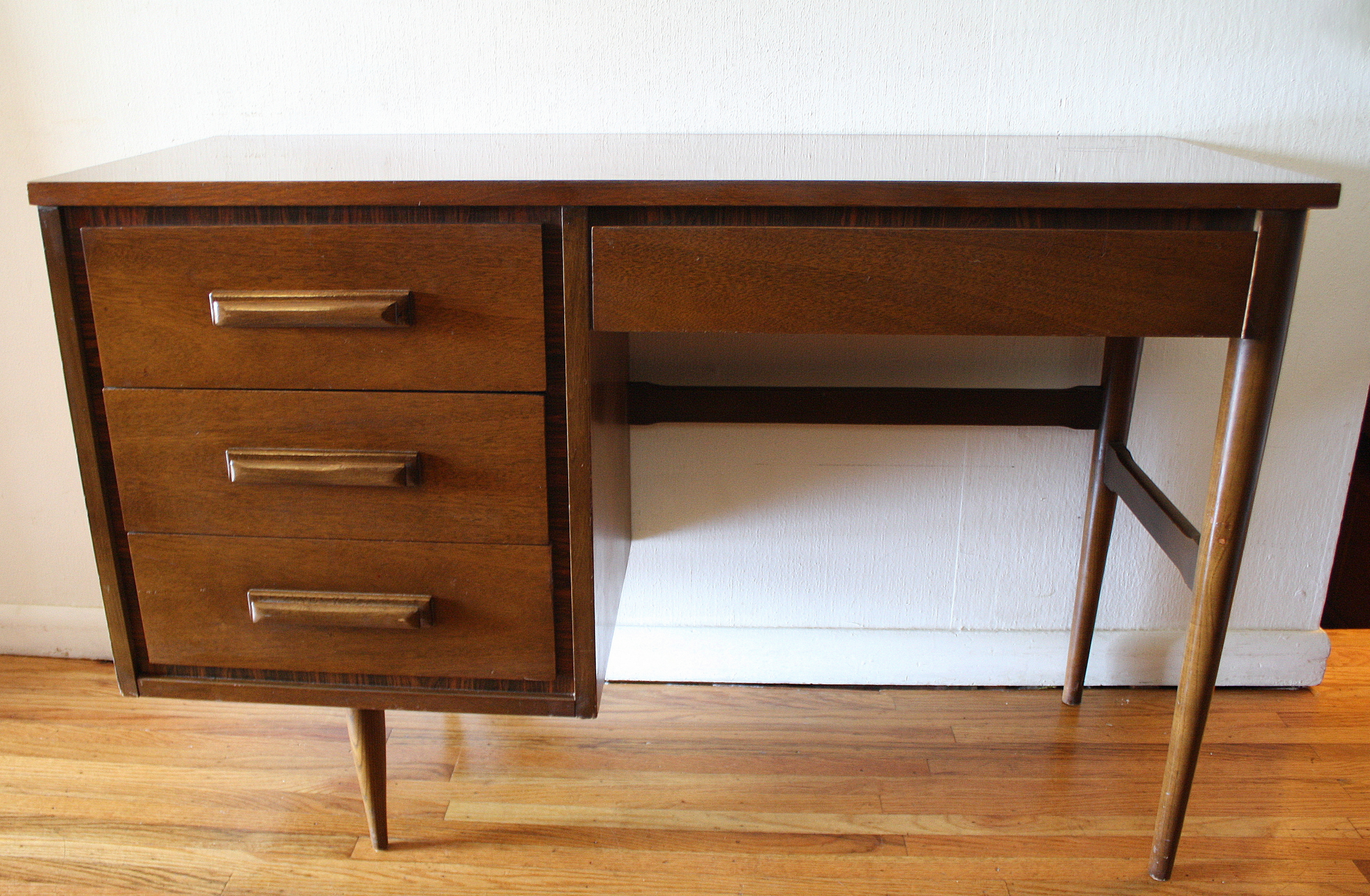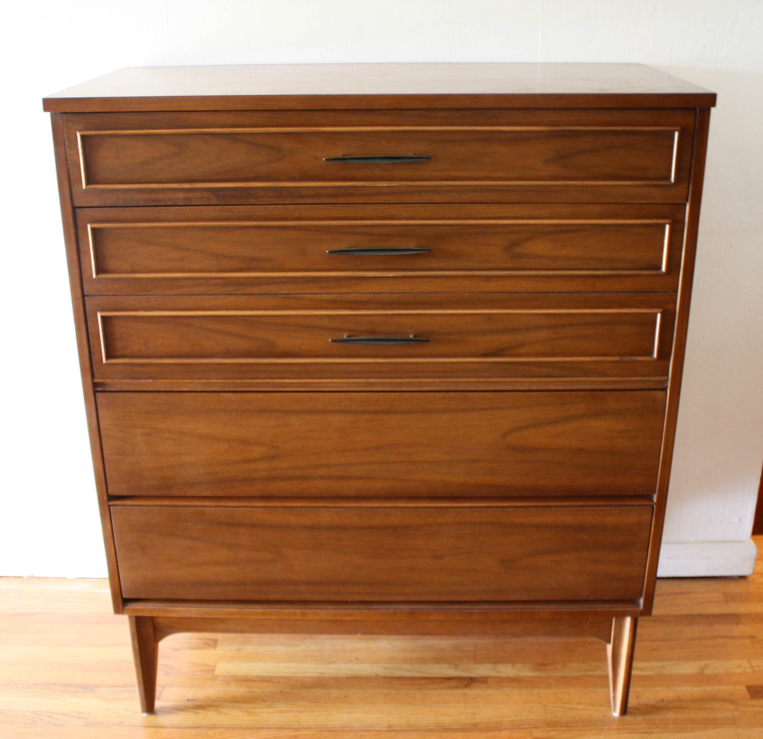 This is a mid century modern cedar chest bench by Lane. It has 2 dovetailed drawers with brass pulls, and an upholstered seat that lifts up to trunk storage. Dimensions: 60″W x 18.5″D x 18″H, 20″H with attached cushion.