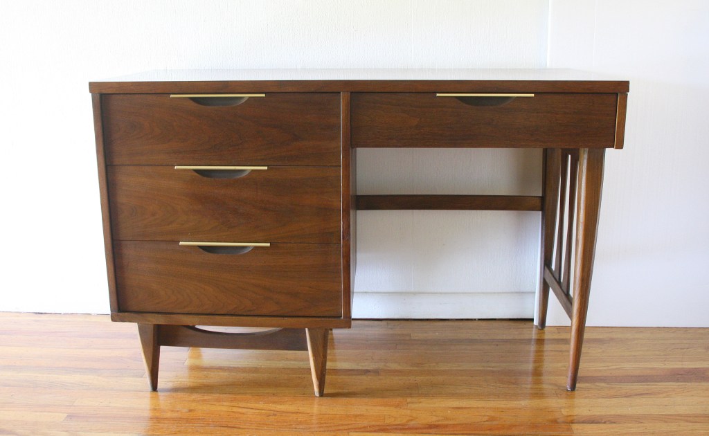 These are 2 mid century modern Campaign pieces by Thomasville. The side end table nightstand has 3 dovetailed drawers with gorgeous brass pulls and accents: 18″W x 12″D x 27″H. The slim cabinet has 5 dovetailed drawers with the same brass pulls and accents: 28″W x 9″D x 34″H.