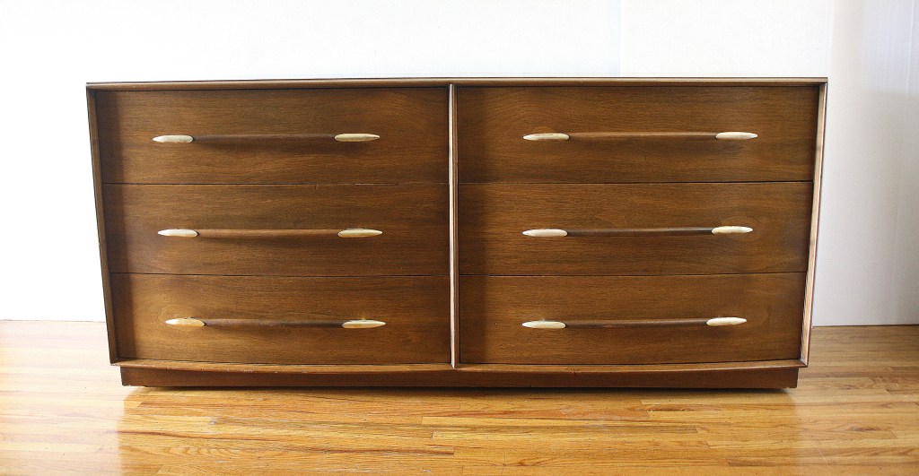 This is a stunning mid century modern low dresser designed by T.H. RobsJohn-Gibbings for Widdicomb. It has 6 dovetailed drawers with their signature brass tipped tapered walnut pulls, on a floating base, with a subtle convex curve in its design. The top drawers have floating valet trays and are maker’s marked inside. Dimensions: 67″W x 22″D x 30″H.