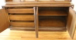 This is a mid century modern rolling serving bar cart from the Broyhill Premier collection. It has 2 folding extension leaves, 2 portable serving trays, and 2 dovetailed drawers with brass accented knobs. The top and serving trays have modern black formica tops, perfect for serving. Dimensions: 38″W (leaves folded down), 65″W (leaves extended out), 19″D, 32″H.