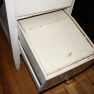 This is a mid century modern bar cabinet that has a beautiful tile top with an extension leaf on one side for extra serving space when needed. On the other side behind a fold away door, is a bar cabinet that has a pull out top shelf with spacers for glassware and an ice bucket. There is also a bottom shelf that holds bottles and more bar ware accessories. Dimensions: 33″W x 20″D x 28″H. The extension leaf adds an extra 11″D, for a total of 31″D when fully extended.