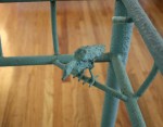 This is a mid century modern hoop chair in the style of John Hauser, with a round cast iron base with splayed legs. Its seat and back have been newly reupholstered in a supple turquoise blue naugahyde. Seat width: 20.5″, seat depth: 18″, seat height: 17″ , back height: 29.5″. Overall dimensions: 29″W x 26.5″D x 29.5″H.
