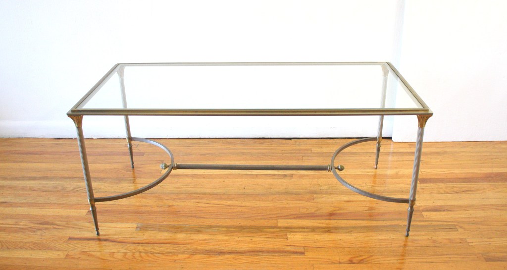 This is a mid century modern Maison Jansen style coffee table in polished steel and brass with an inset glass top. It has a beautiful neoclassical design with a curule form stretcher base and tapered legs. Dimensions: 42″W x 20″D x 18″H.