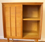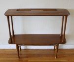 This is a mid century modern media stand made by the Gusdorf company. It is made of solid wood and has two tiers. It has slats on the top tier that could be used to pass wires through. Perfect for flat screens or a cool looking console table, this piece is very unique. Beautiful streamlined design with the signature mcm tapered legs.