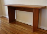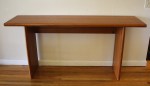 This is a mid century modern console table with a dovetailed drawer and tapered legs. Great to use as a console table bar, desk, or sofa table. Dimensions: 46″W x 17.75″D x 30″H.