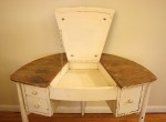 This is an antique vanity with a fliptop storage compartment. It has a great unique shape and a beautiful patina. Great for a shabby chic console table.