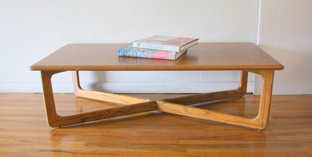 This is a mid century modern coffee table by Lane. It has a beautiful wood grain with a beautiful wood grain on top and sculpted cross base. Dimensions: 52″W x 24″D x 15″H.