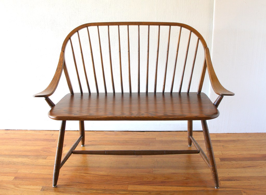 This is a set of 4 mid century modern folding chairs by Coronet. They have solid wood frames with curved backs, and the seats are upholstered in a gray naugahyde. Dimensions: seat width: 16″, seat depth: 15.5″, seat height: 18″, back height: 29″.