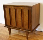 This is a mid century modern side end table from American by Martinsville. It is made of solid wood, has two doors, a dovetailed drawer and a bottom shelf. Gorgeous design, fantastic utility.