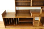 This is a mid century modern expanding media bookcase desk unit. One of the coolest pieces we have had so far, this unit has a bookshelf hutch with adjustable shelves, a desk, or a record player with slats on the bottom for files or records. There are also bottom shelves and a drawer. This unit expands to fit your spacial needs.