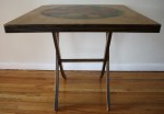 This is a mid century modern Danish teak dining chair set and folding dining table. The chairs solid teak frame has a sculpted curved back. The upholstered seats have been recovered in a teal tweed. Dimensions: 18″ seat width, 17″ seat depth, 18″ seat height, 30″ back height. The teak table has a simple clean design with tapered legs and 2 folding extension leaves. Dimensions: 23.5″W (leaves down), 2 folding leaves: each leaf 19.5″W, 37″D, 28.5″H.