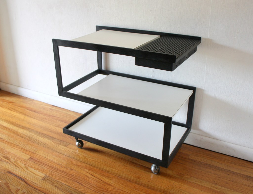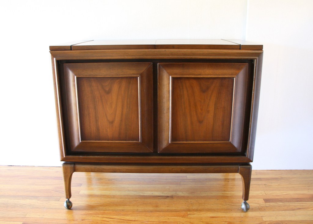 This is a mid century modern table designed by John Keal for Brown Saltman. It has a gorgeous sculpted base with tapered legs, and a top with surfboard edges and black and white lacquered accents in its design. 30″W x 22″D x 22.5″H.