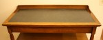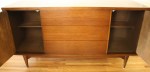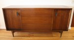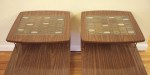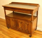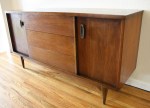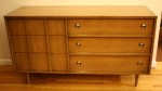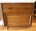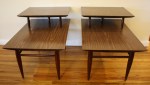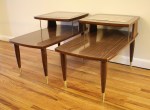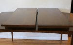These are 2 mid century modern dining tables with a surfboard design, sculpted tapered legs and base, and a beautiful wood grain. The first one is solid wood, has 2 extension leaves. Each leaf adds an additional 18 inches. Dimensions: 65″W (without the leaves) x 39″D x 30″H. The second dining table is solid wood, with 1 extension leaf which adds 12″, a formica wood grain top, and tapered legs. Dimensions: 60″W (without the leaf) x 40″D x 30″H.