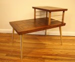 This is a mid century modern side end table that has a solid base with tapered legs, and a mod white formica top. Dimensions: 28″W x 21″D x 20″H.