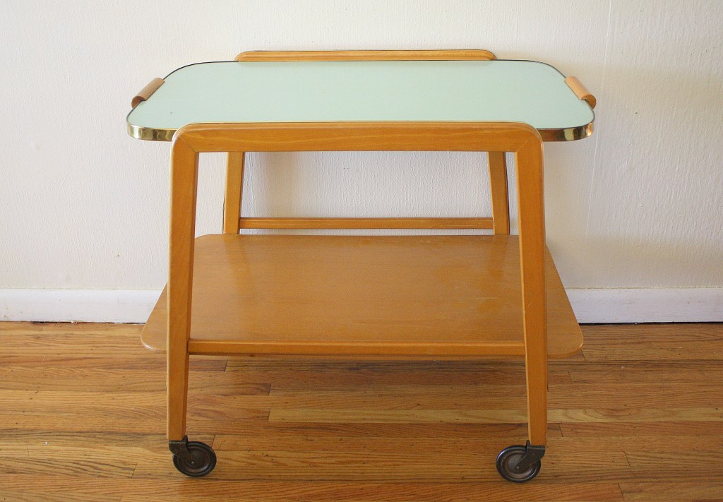 This is a mid century modern cube record cabinet that has a chrome banded turquoise formica top with a boomerang graphic. It has a floating pedestal wood base with 2 doors and an inside record slat divider. Dimensions: 19.5″W x 18.5″D x 18″H.