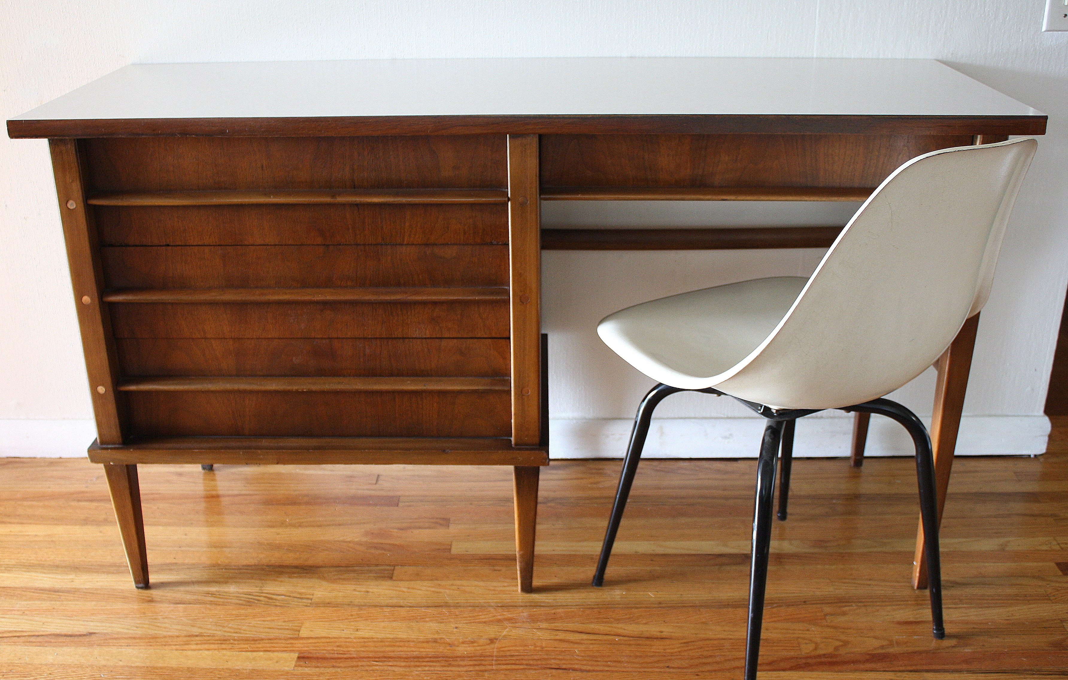 This is a mid century modern desk from Kent Coffey’s Simplicite line. It has 4 dovetailed drawers with a streamlined design, a mod white formica top, and tapered legs: 56″W x 19″D 31″H. Shown with our Herman Miller fiberglass chair sold separately on the site.