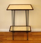 These are 2 mid century modern hairpin side tables. The first side table was made in Denmark. This mini side table has a black formica top and the mcm signature hairpin legs. Great for small spaces, would also make a great planter. The second side table also has the hairpin legs, a formica top and lower shelf.