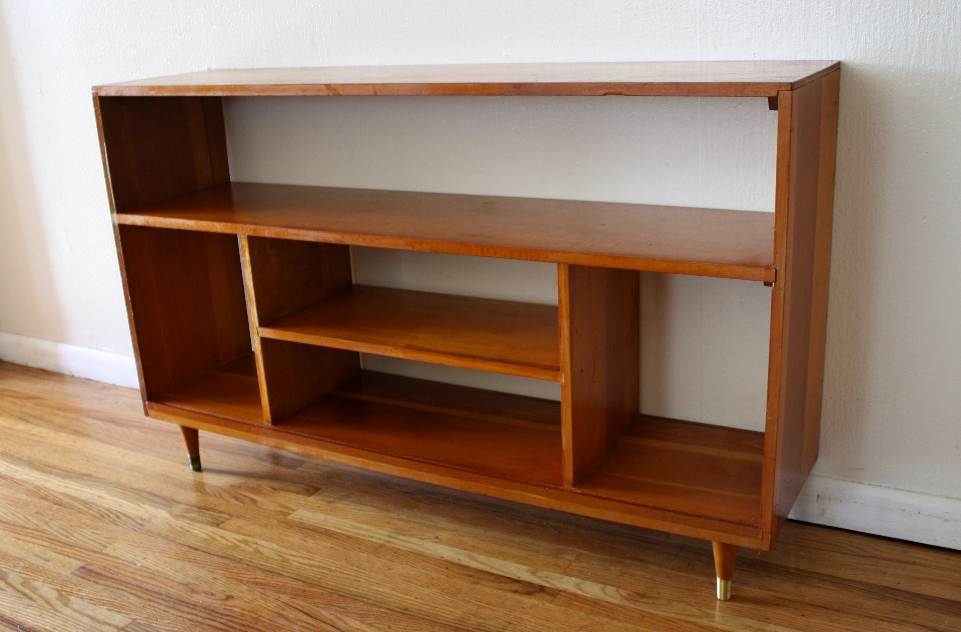 These are 2 mid century modern bookshelves. The first is a Heywood Wakefield bookshelf. It is made of solid wood, has the signature HW curves, adjustable shelves and a great slanted design. Dimensions: 32.5″W x 14″D x 32.5″H. The second bookshelf has several storage units,has tapered legs, and is made of solid wood. Dimensions: 48″W x 12″D x 30″H.