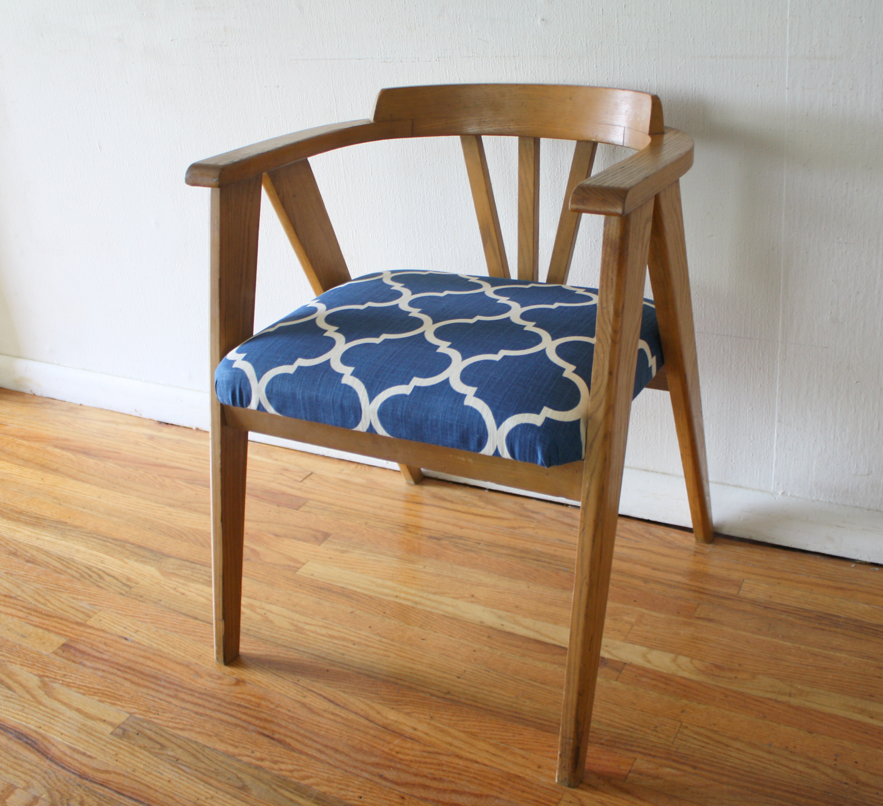 These are 3 mid century modern arm chairs recovered in new modern fabric. The first chair recovered in blue and white fabric has a beautiful dramatic side profile with splayed legs. The second is by Heywood Wakefield and is recovered in aqua and white chevron. The third has an inlaid design in the chair back, angled arms, recovered in a modern gear pattern.