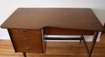 This is a mid century modern desk by Hooker. It has a beautiful floating design with metal tipped tapered legs. It has 3 dovetailed drawers with curved brass pulls, a large file drawer on the bottom left, 1 dovetailed utility drawer below the desk, and a shelf cubby. It has finished back so it can be a front facing executive office desk. Dimensions: 49″W x 25″D x 29.5″H.