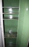 This is a vintage industrial bar serving cart in aqua. It is made of steel and rolls on wheels. Dimensions: large cart: 28″W x 21″D x 38″H.