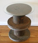 This is an antique industrial spool table from the Camden Wire Co. in New York. This side table is made of 2 mini wooden spools used to hold wire. Each spool has a great patina, distinctive marks and rimmed with metal. There is an optional glass top that comes with it.