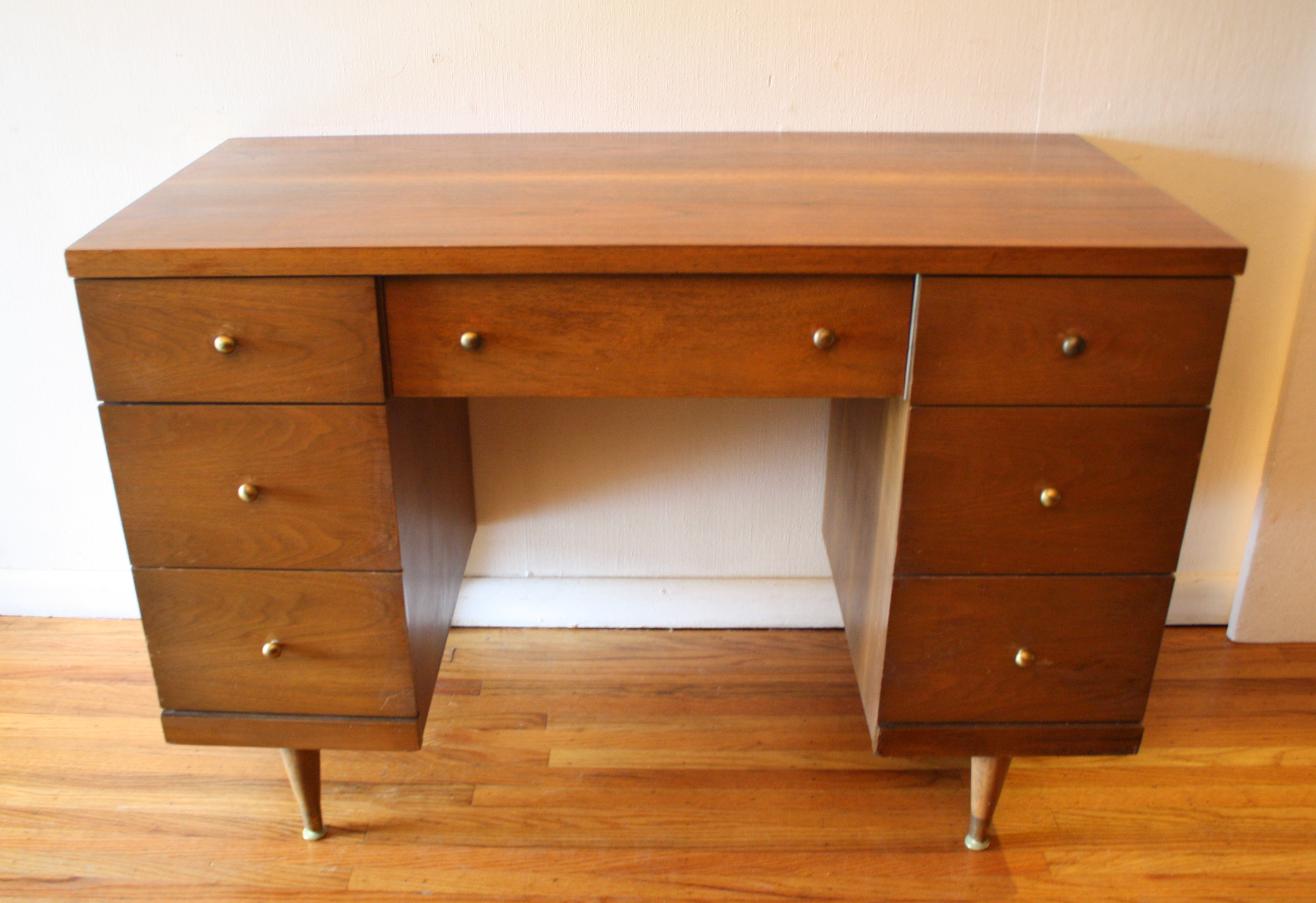 This is a mid century modern desk with a keyhole design, 7 dovetailed drawers with sculpted brass handles, and tapered legs: 46″W x 18″D x 30″H.