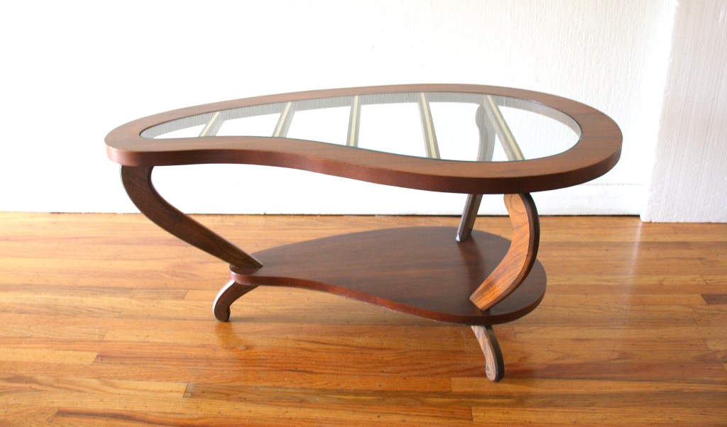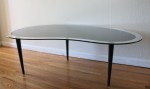 This is a mid century modern solid mahogany free form kidney coffee table with brass tipped tapered legs by Founders Furniture. It is maker’s marked on the bottom Modern by Founders. Dimensions: 48″W x 31″D (thicker side) x 15″H.