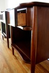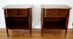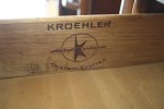 These are 2 sets of mid century modern dining chair sets. Each set has 2 captain arm chairs and 4 side chairs. The first set has slatted bowtie design backs, solid wood bases and newly covered seats in an aqua and eggshell chevron. The second set is by Kroehler and has sculpted wood backs, solid wood bases, and newly covered seats in a teal tweed.