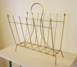 These are 2 brass art deco magazine holder racks. The first has a sunburst atomic ray design: 20″W x 9.5″D x 17″H. The second has deco geometric curves: 16″ W x 7″ D x 23.5″ H.
