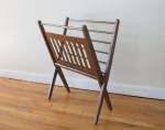 This is a folding mid century modern magazine rack made of solid wood. It has a horizontal slatted angular design. Dimensions: 18.5″W x 23.5″H.