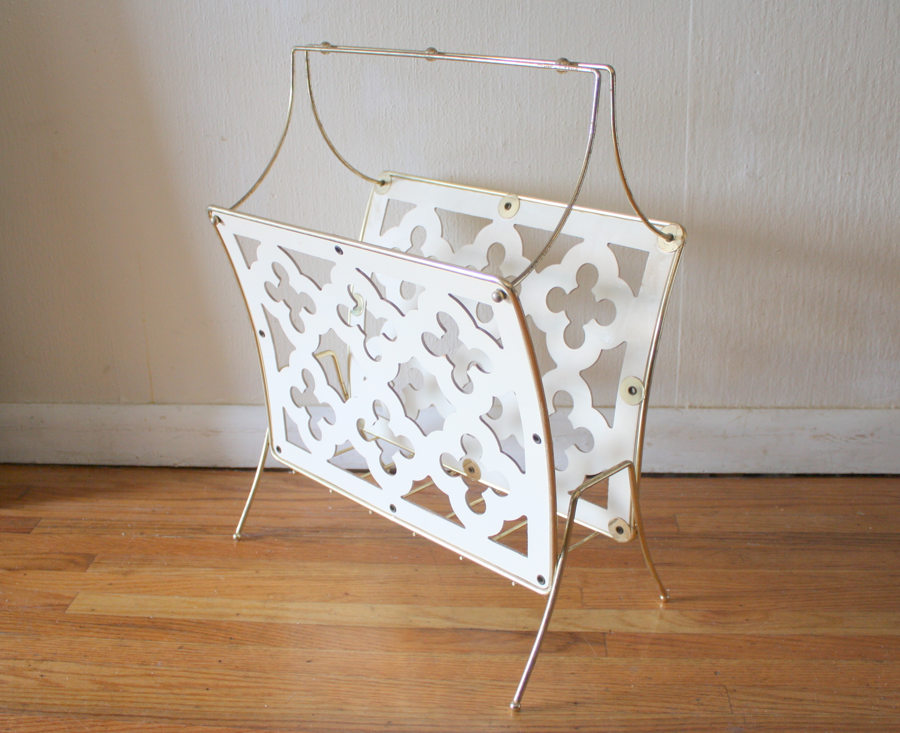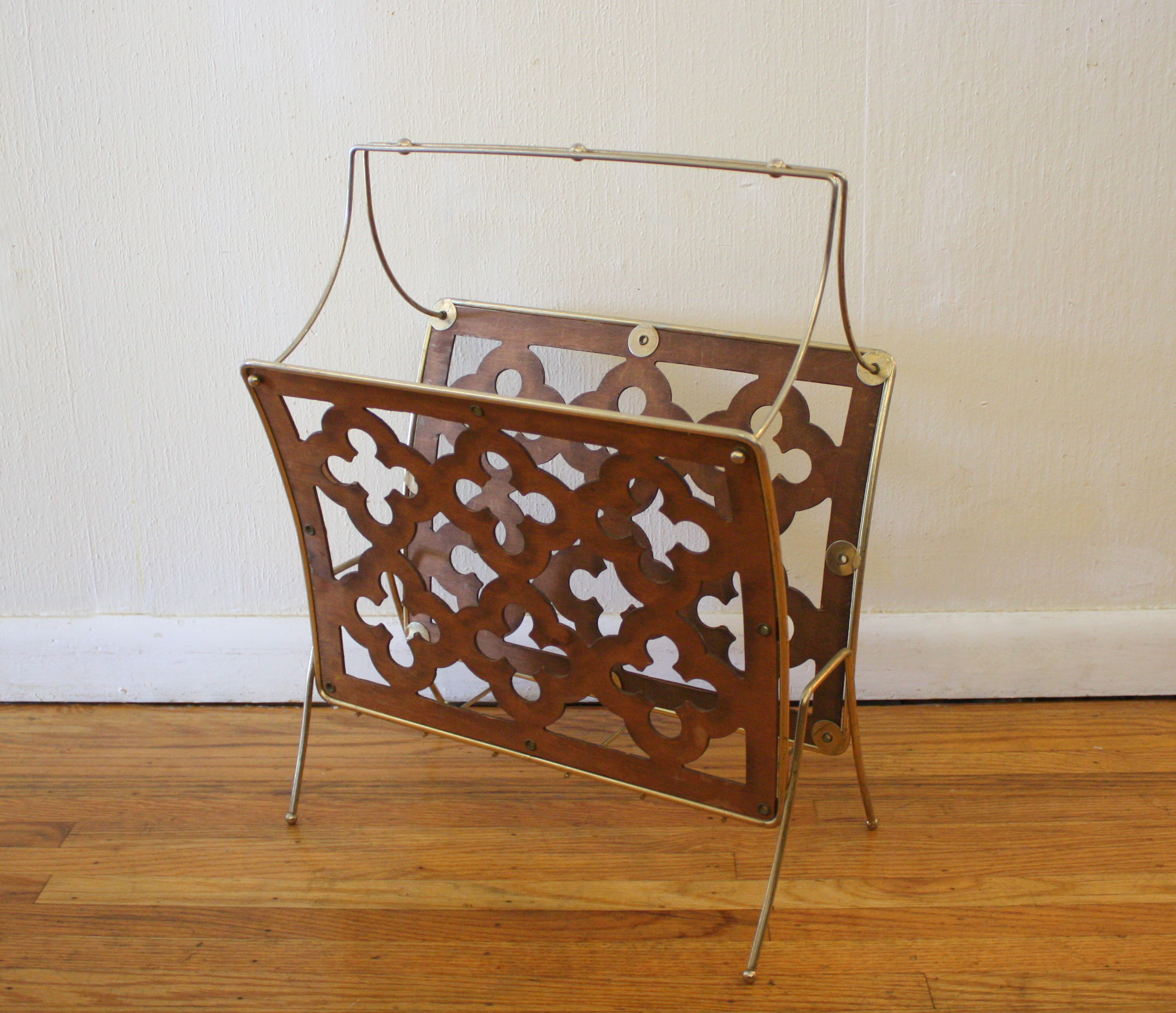 This is a mid century modern magazine holder. It is made of solid wood and brass, and has a beautiful cut our design. Dimensions: 16.5″W x 9.5″D x 20.5″H.