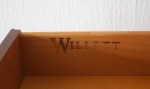 This is mid century modern coffee table by Willett in solid cherry. It has a beautiful asymmetrical design with splayed legs, 3 dovetailed drawers, and a glass top that shows off a slanted magazine rack and shelf. Dimensions: 48″W x 21″D x 18″H.
