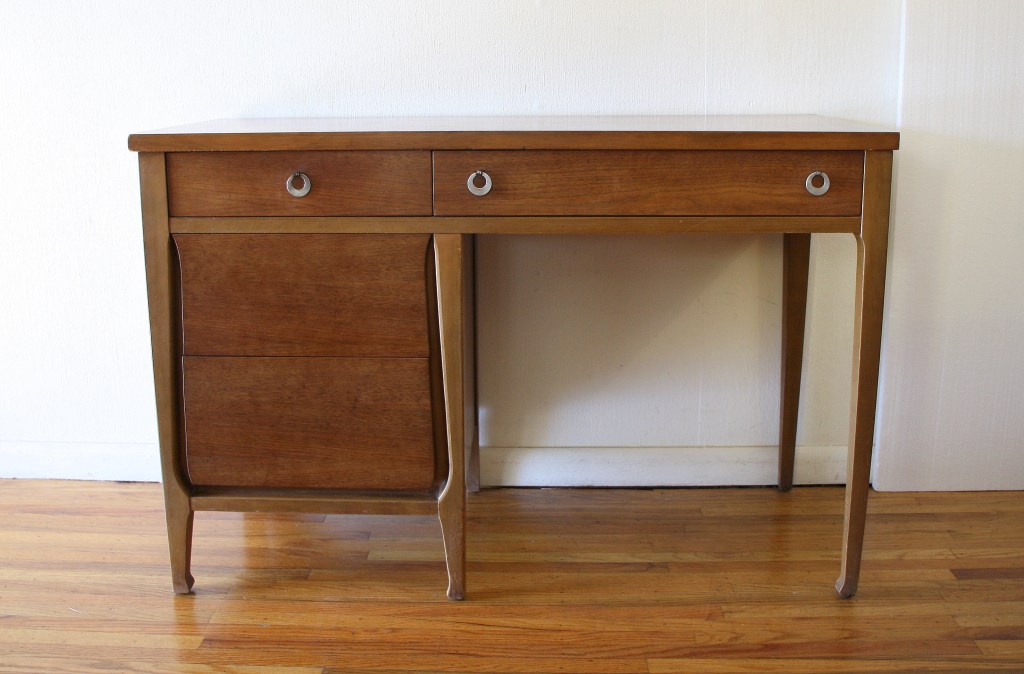 This is a mid century modern desk with 4 dovetailed drawers, a gorgeous curved accented design in the drawers, round metal pulls, and tapered legs. Dimensions: 46″W x 19″D x 31″H.