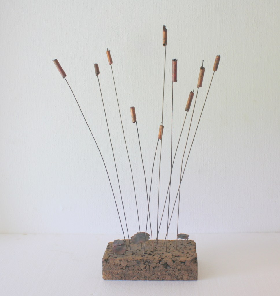 This is a mid century modern Brutalist cattail sculptures set in a block of cork.  Dimensions: 8.5″W x 4.5″D x 22″H.