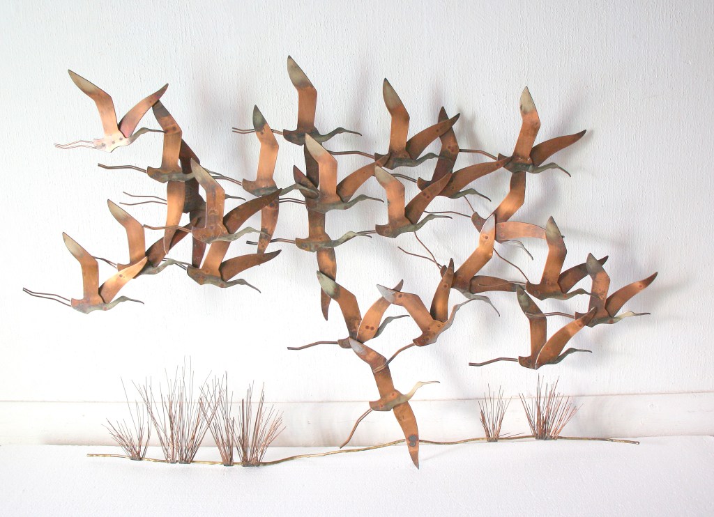 This is a mid century modern Brutalist wall sculpture hanging of birds in flight over tall grasses. Dimensions: 38.5″W x 245″H.