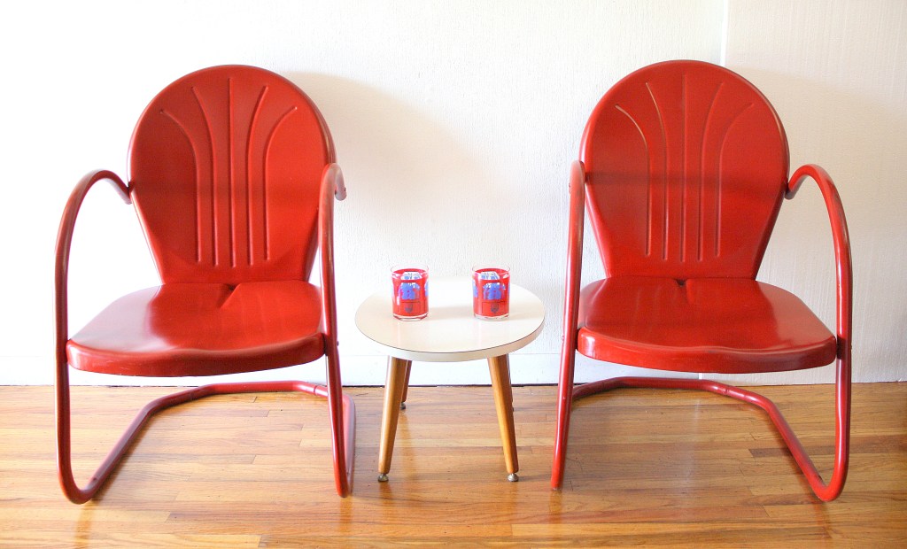 This is a pair of mid century modern metal clamshell chairs in a vibrant cherry red. It has the signature curved arms, contoured seat, and detailing in the back. Seat width: 19″, seat depth: 19″, seat height: 15″, back height: 34″.