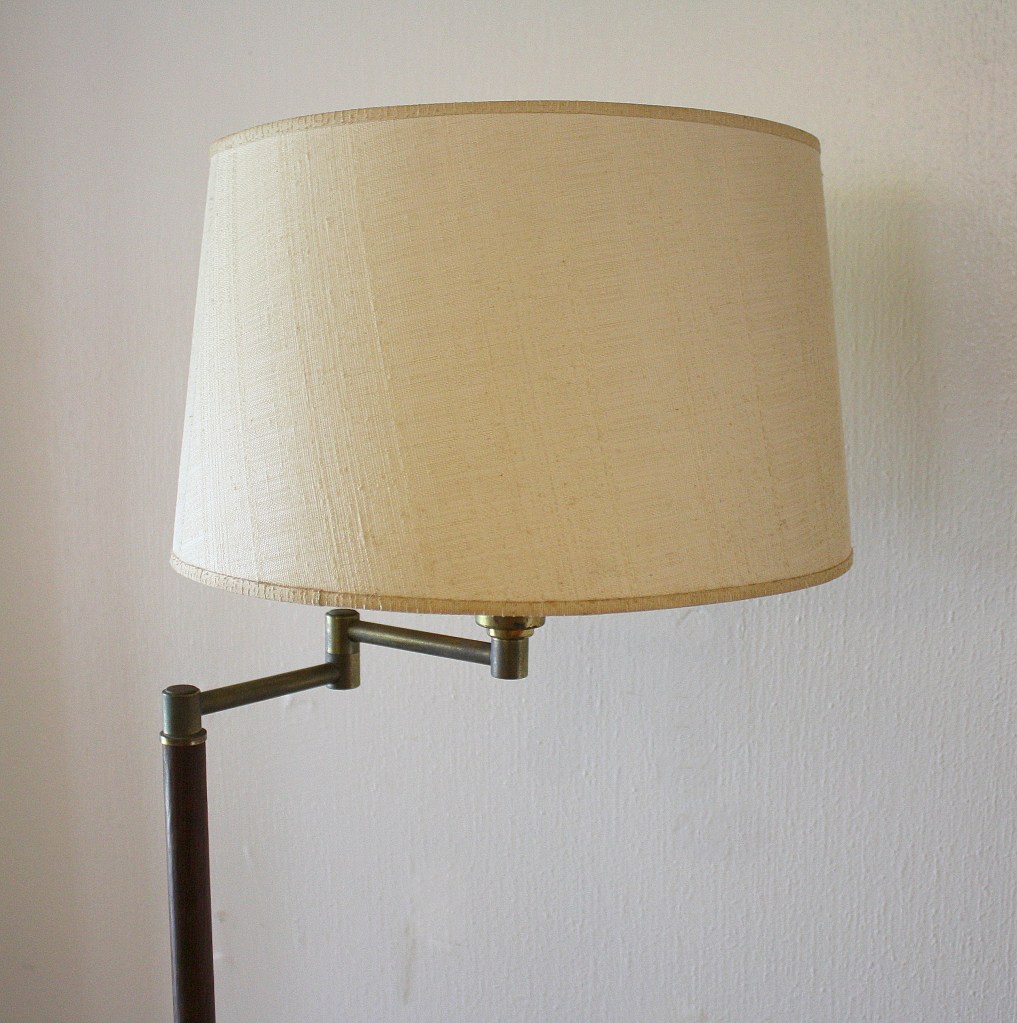 These are three upholstered ottomans with solid wood bases and upholstered tops. The first mcm ottoman has a turquoise green patterned fabric and a tapered cross leg design: 20″dia x 18″H. The second mcm ottoman has a seagrass colored fabric, tapered legs and swivels: 18″dia x 17″H. The third ottoman is a vintage piece with an interesting pink scale fabric and curvaceous Queen Anne legs: 24″W x 18″D x 15″H.
