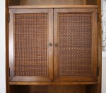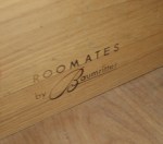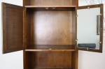 This is a mid century modern 3 tiered bar serving cart from Drexel’s Heritage series in the Hollywood Regency style. It has a beautiful brass and walnut frame, smoked glass middle shelf, and a walnut parquet bottom shelf. The top has a reversible mirrored and mod white top. Dimensions: 40.5″W x 19.5″D x 31″H.