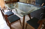 This is a mid century modern side end table with a floating cross base and square top. In the table top’s design there are 2 mod inlaid black and white formica tiles. Dimensions: 26″W x 26″D x 23″H.