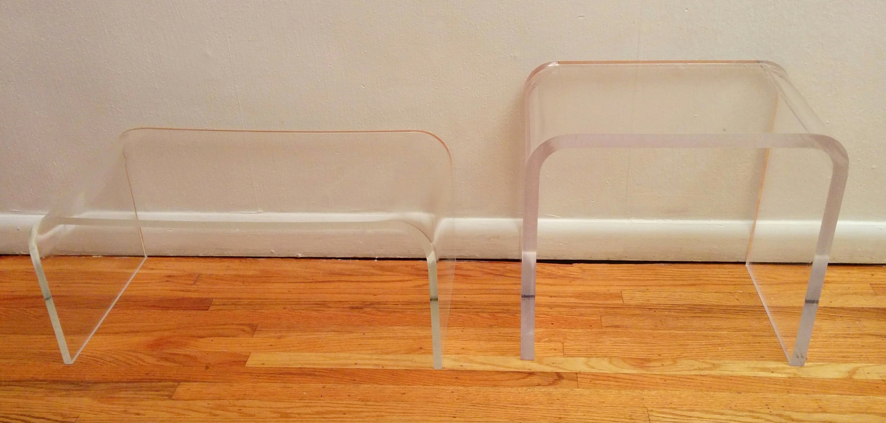 This is a selection of mid century modern lucite tables with a simple clean design. The first is a coffee table: 43.5″W x 16″W x 15.5″H. The second picture features a table on the left that can be utilized as a low nesting table to the coffee table, shelf, or laptop table: 24″W x 13″D x 11″H. The table on the right is a side table: 18″W x 12″D x 16″H.