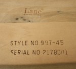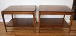 There are three pairs of 2 tiered mid century modern side end tables. The first pair is made of solid wood and has parquet tops and slatted bases: 18.5″W x 30″D x 21.5″H. The second pair has plexi glass tops with a colorful faux tile design and brass tipped tapered legs. The third pair has a floating design with solid wood bases and formica tops: 18″W x 30″D x 19.5″H.